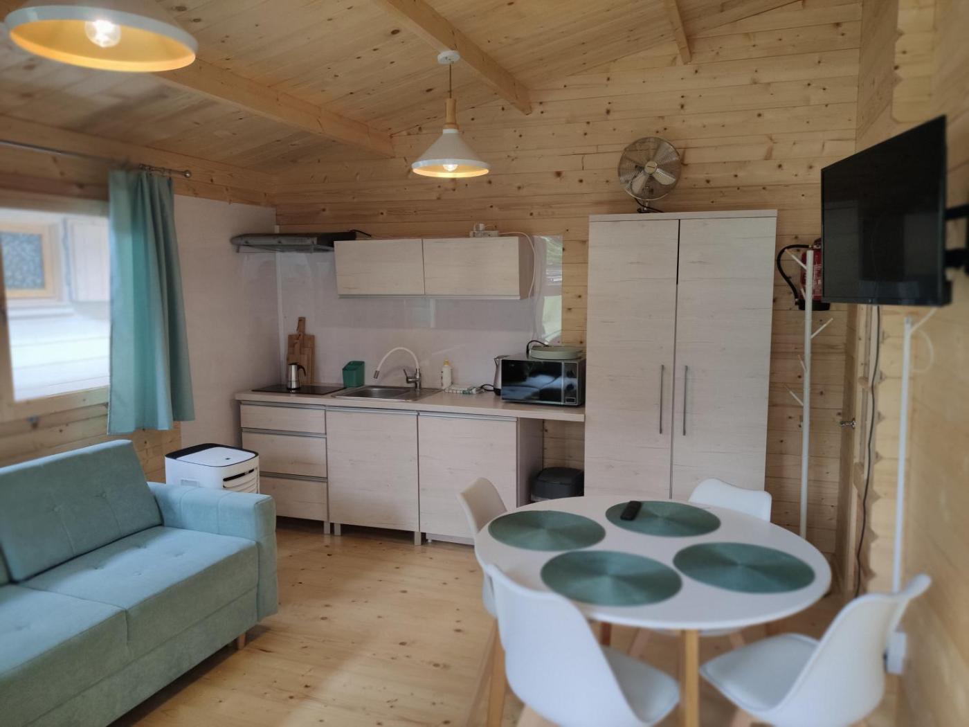 Domek. This air-conditioned chalet consists of 1 living room, 1 separate bedroom and 1 bathroom with a shower. The fully equipped kitchen features a stovetop, a refrigerator, kitchenware and a microwave. This chalet has a wardrobe, an electric kettle, a flat-screen TV and a terrace. The unit offers 2 beds. Domek - 4 osobowy. Powierzchnia pokoju ok.: 35 mkw.