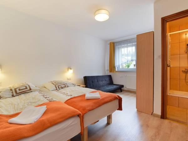 Rodzinny apartament typu Studio. Jest to pokój rodzinny z jadalnią, szafą oraz prywatną łazienką z prysznicem. W kompletnie wyposażonym aneksie kuchennym przygotowano płytę kuchenną, lodówkę, przybory kuchenne i czajnik elektryczny. Wyposażenie pokoju obejmuje ogrzewanie oraz telewizor z płaskim ekranem. W tej opcji zakwaterowania do dyspozycji gości są 4 łóżka. Rodzinny - 6 osobowy. ;